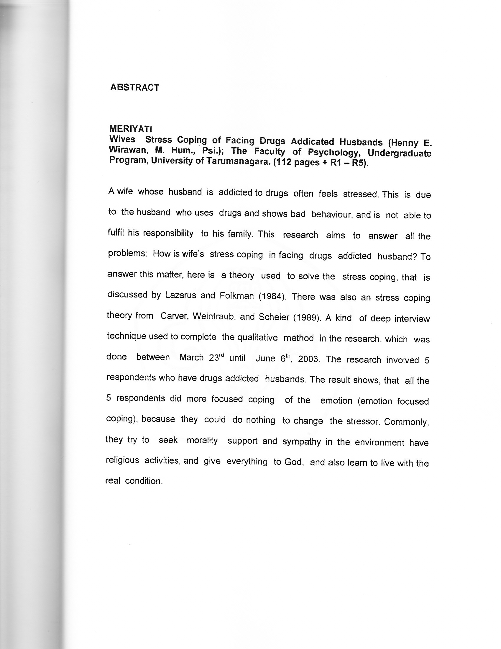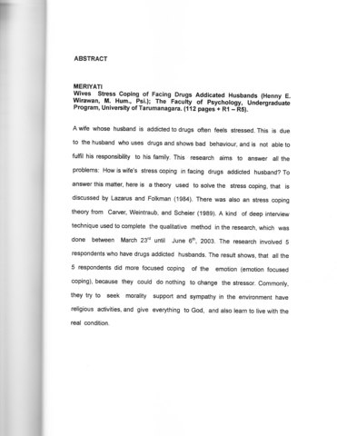 "A wife whose husband is addicted to drugs often feels stressed. This is due to the husband who uses drugs and shows bad behaviour, and is not able to fun his responsibility to his family. This research aims to answer all the problems: How is wife's stress coping in facing drugs addicted husband? To answer this matter, here is a theory used to solve the stress coping, that is discussed by Lazarus and Folkman (1984). There was also an stress coping theory from Carver, Weintraub, and Scheier (1989). A kind of deep interview technique used to complete the qualitative method in the research, which was done between March 23rd until June 6th, 2003. The research involved 5 respondents who have drugs addicted husbands. The result shows, that all the 5 respondents did more focused coping of the emotion (emotion focused coping), because they could do nothing to change the stressor. Commonly, they try to seek morality support and sympathy in the environment have religious activities, and give everything to God, and also learn to live with the real condition.