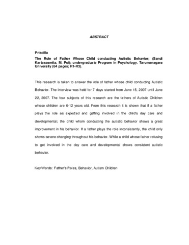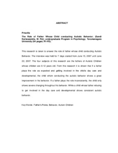 This research is taken to answer the role of father whose child conducting Autistic Behavior. The interview was held for 7 days started from June 15, 2007 until June 22, 2007. The four subjects of this research are the fathers of Autistic Children whose children are 6-12 years old. From this research it is shown that if a father plays the role as expected and getting involved in the child’s day care and developmental, the child whom conducting the autistic behavior shows a great improvement in his behavior. If a father plays the role inconsistently, the child only shows severe changing throughout his behavior. While a child whose father refusing to get involved in the day care and developmental shows consistent autistic behavior.