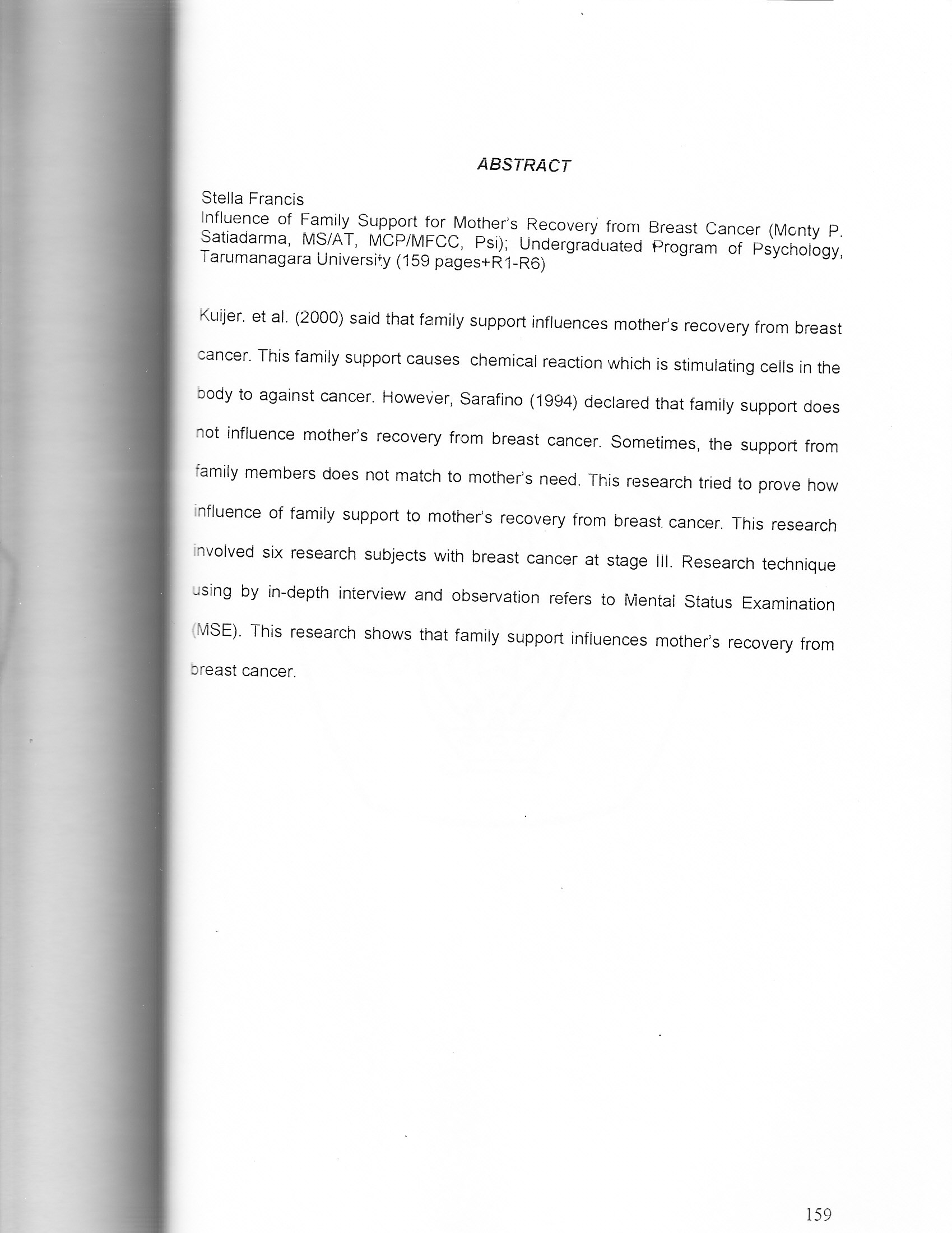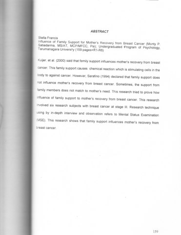 Francis, Stella (2004) Pengaruh Dukungan Keluarga Terhadap Kesembuhan Ibu Yang Mengidap Kanker Payudara. Skripsi thesis, Universitas Tarumanagara.