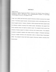 Kujer. et al. (2000) said that family support influences mother's recovery from breast cancer. This family support causes chemical reaction which is stimulating cells in the body to against cancer. However, Sarafino (1994) declared that family support does not influence mother's recovery from breast cancer. Sometimes, the support from family members does not match to mother's need. This research tried to prove how influence of family support to mother's recovery from breast. cancer. This research involved six research subjects with breast cancer at stage III. Research technique using by in-depth interview and observation refers to Mental Status Examination (MSE). This research shows that family support influences mother's recovery from breast cancer.