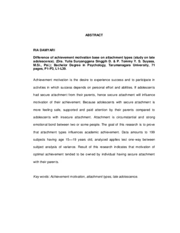 Damyari, Ria (2007) Perbedaan Motivasi Berprestasi Berdasarkan Jenis Attachment. Studi Pada Remaja Akhir. Skripsi thesis, Universitas Tarumanagara.