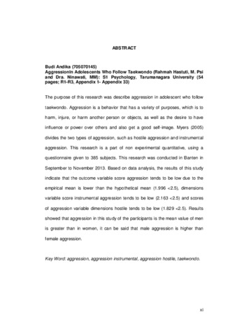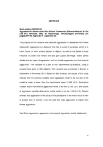 The purpose of this research was describe aggression in adolescent who follow taekwondo. Aggression is a behavior that has a variety of purposes, which is to harm, injure, or harm another person or objects, as well as the desire to have influence or power over others and also get a good self-image. Myers (2005) divides the two types of aggression, such as hostile aggression and instrumental aggression. This research is a part of non experimental quantitative, using a questionnaire given to 385 subjects. This research was conducted in Banten in September to November 2013. Based on data analysis, the results of this study indicate that the outcome variable score aggression tends to be low due to the empirical mean is lower than the hypothetical mean (1.996 <2.5), dimensions variable score instrumental aggression tends to be low (2.163 <2.5) and scores of aggression variable dimensions hostile tends to be low (1.829 <2.5). Results showed that aggression in this study of the participants is the mean value of men is greater than in women, it can be said that male aggression is higher than female aggression.