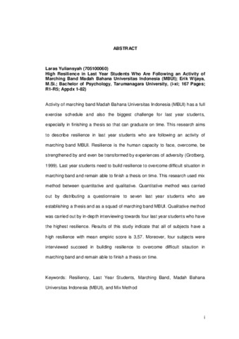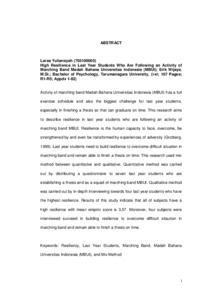 Activity of marching band Madah Bahana Universitas Indonesia (MBUI) has a full exercise schedule and also the biggest challenge for last year students, especially in finishing a thesis so that can graduate on time. This research aims to describe resilience in last year students who are following an activity of marching band MBUI. Resilience is the human capacity to face, overcome, be strengthened by and even be transformed by experiences of adversity (Grotberg, 1999). Last year students need to build resilience to overcome difficult situation in marching band and remain able to finish a thesis on time. This research used mix method between quantitative and qualitative. Quantitative method was carried out by distributing a questionnaire to seven last year students who are establishing a thesis and as a squad of marching band MBUI. Qualitative method was carried out by in-depth interviewing towards four last year students who have the highest resilience. Results of this study indicate that all of subjects have a high resilience with mean empiric score is 3,57. Moreover, four subjects were interviewed succeed in building resilience to overcome difficult sitaution in marching band and remain able to finish a thesis on time.