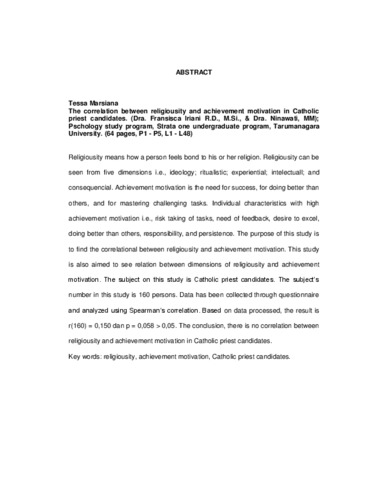 Marsiana, Tessa (2007) Hubungan Antara Religiusitas Dan Motivasi Berprestasi Pada Calon Imam Katolik. Skripsi thesis, Universitas Tarumanagara.