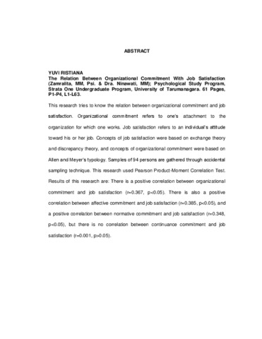 This research tries to know the relation between organizational commitment and job satisfaction. Organizational commitment refers to one’s attachment to the organization for which one works. Job satisfaction refers to an individual’s attitude toward his or her job. Concepts of job satisfaction were based on exchange theory and discrepancy theory, and concepts of organizational commitment were based on Allen and Meyer’s typology. Samples of 94 persons are gathered through accidental sampling technique. This research used Pearson Product-Moment Correlation Test. Results of this research are: There is a positive correlation between organizational commitment and job satisfaction (r=0.367, p<0.05). There is also a positive correlation between affective commitment and job satisfaction (r=0.385, p<0.05), and a positive correlation between normative commitment and job satisfaction (r=0.348, p<0.05), but there is no correlation between continuance commitment and job satisfaction (r=0.001, p>0.05).