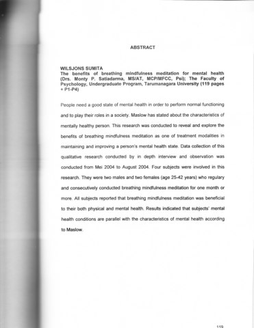 Sumita, Wilsjons (2005) Manfaat Breathing Mindfulness Editation Bagi Kesehatan Mental Individu. Skripsi thesis, Universitas Tarumanagara.