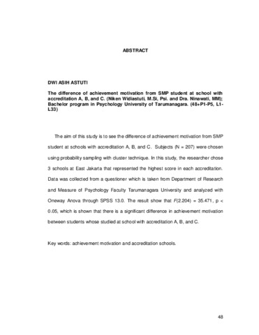 The aim of this study is to see the difference of achievement motivation from SMP student at schools with accreditation A, B, and C. Subjects (N = 207) were chosen using probability sampling with cluster technique. In this study, the researcher chose 3 schools at East Jakarta that represented the highest score in each accreditation. Data was collected from a questioner which is taken from Department of Research and Measure of Psychology Faculty Tarumanagara University and analyzed with Oneway Anova through SPSS 13.0. The result show that F(2.204) = 35.471, p < 0.05, which is shown that there is a significant difference in achievement motivation between students whose studied at school with accreditation A, B, and C.