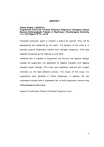 Premarital pregnancy event is certainly a painful for parents. They will be disappointed and saddened by this event. The purpose of this study is to describe parents' forgiveness towards their teenage's pregnancy. Time data collection conducted during February to June 2014. Someone who is capable of forgiveness has reduced the negative feelings towards the perpetrator, the perpetrator of negative thoughts, and negative attitudes toward offender. This study used qualitative methods with in-depth interviews as the data collection process. The results of this study, four respondents were generally in hollow forgiveness. In general, the four respondents already have a forgiveness yet not fully forgiveness, because they still feel disappointed and sad.