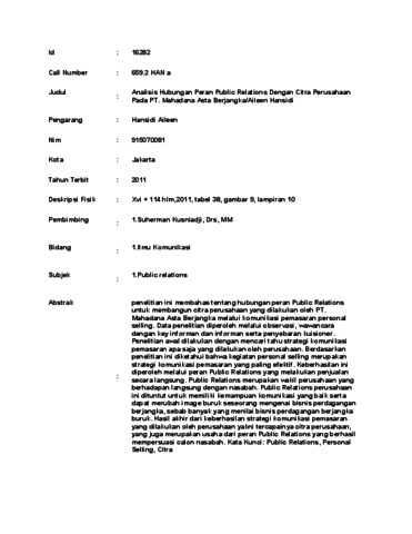 Aileen, Hansidi (2011) Analisis Hubungan Peran Public Relations Dengan Citra Perusahaan Pada PT. Mahadana Asta Berjangka. Skripsi thesis, Universitas Tarumanagara.