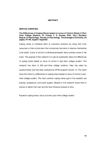 Coping stress is individual effort to overcome stressors by using their inner resources or their environment that consciously has done to improve themselves to be better. Locus of control is individual perception about primary cause of life event. The purpose of this research is to get an explanation about the differences of coping stress based on locus of control in part-timer college student. This research has done to 250 part-timer college students. Data has taken by questionnaires and has been analyzed by SPSS program version 13. The result show that there is a differences of coping stress based on locus of control in part-timer college student. The most common coping stress type in this research are praying, acceptance, and social support. Based on this research stress level in women is higher than men and the most influence stressor is time.