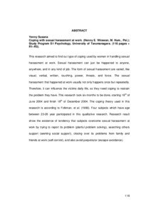 This research aimed to find out type of coping used by women in handling sexual harassment at work. Sexual harassment can just be happened to anyone, anywhere, and in any kind of job. The form of sexual harassment are varied, like visual, verbal, written, touching, power, threats, and force. The sexual harassment that happened at work usually not only happens once but repeatedly. Therefore, it can influence the victims daily life, so they need coping to restrain the problem they have. This research took six months to be done, starting 18th of June 2004 and finish 18th of December 2004. The coping theory used in this research is according to Folkman, et al. (1986). Four subjects who have age between 23-26 years participated in this qualitative research. Research result show the existence of tendency that subjects overcome sexual harassment at work by trying to report its problem (planful problem solving), searching others support (seeking social support), closing over its problems from family and friends at work (self-control), and also avoid perpetrator (escape-avoidance).