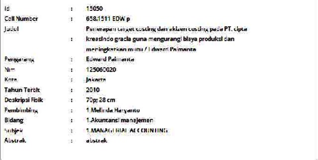 Paimanta, Edward (2010) Penerapan Target Costing dan Kaizen Costing pada PT. Cipta Kreasindo Gracia Guna Mengurangi Biaya Produksi dan Meningkatkan Mutu. Skripsi thesis, Universitas Tarumanagara.